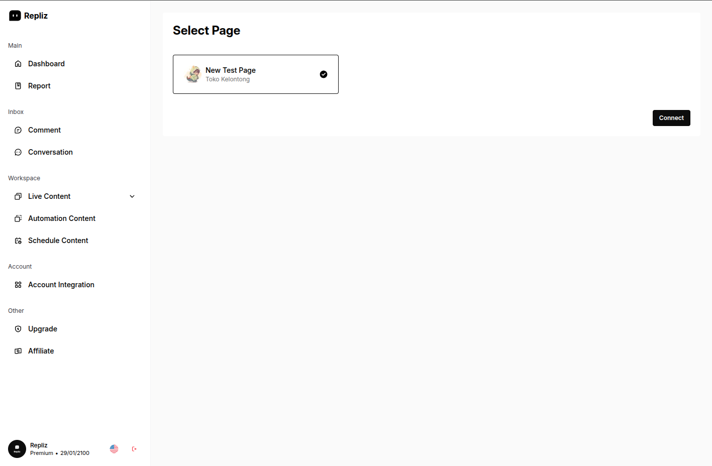 Ikuti langkah-langkah berikut untuk menghubungkan akun Facebook Anda ke Repliz: