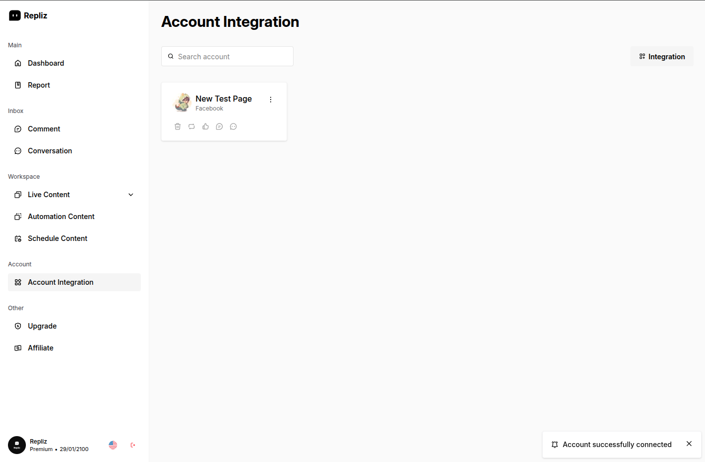 Buka menu Integrasi Akun di dasbor Repliz Anda.