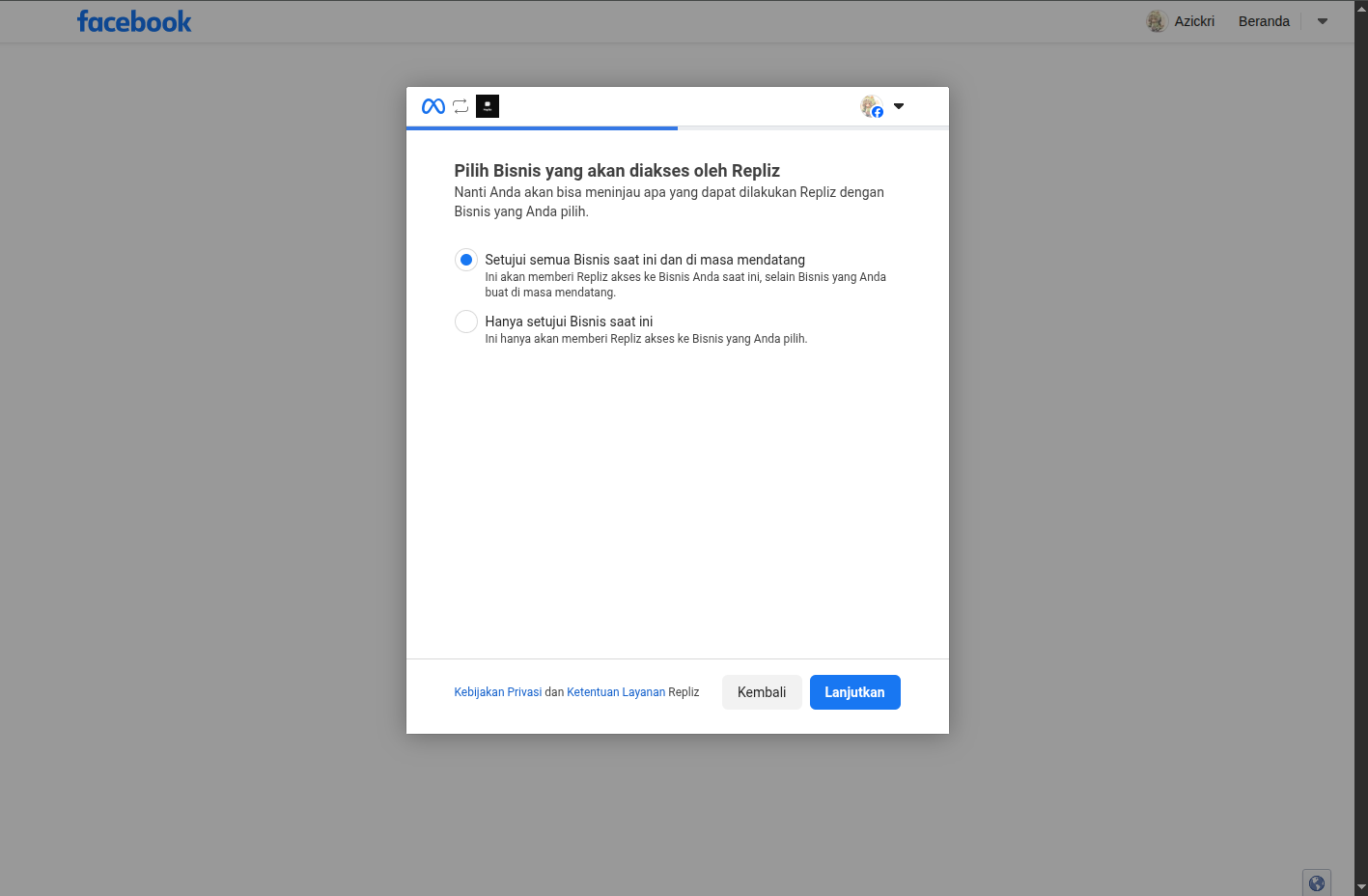 Di jendela otentikasi Facebook, periksa semua izin yang diminta untuk mengizinkan Repliz mengelola halaman dan komentar Anda.