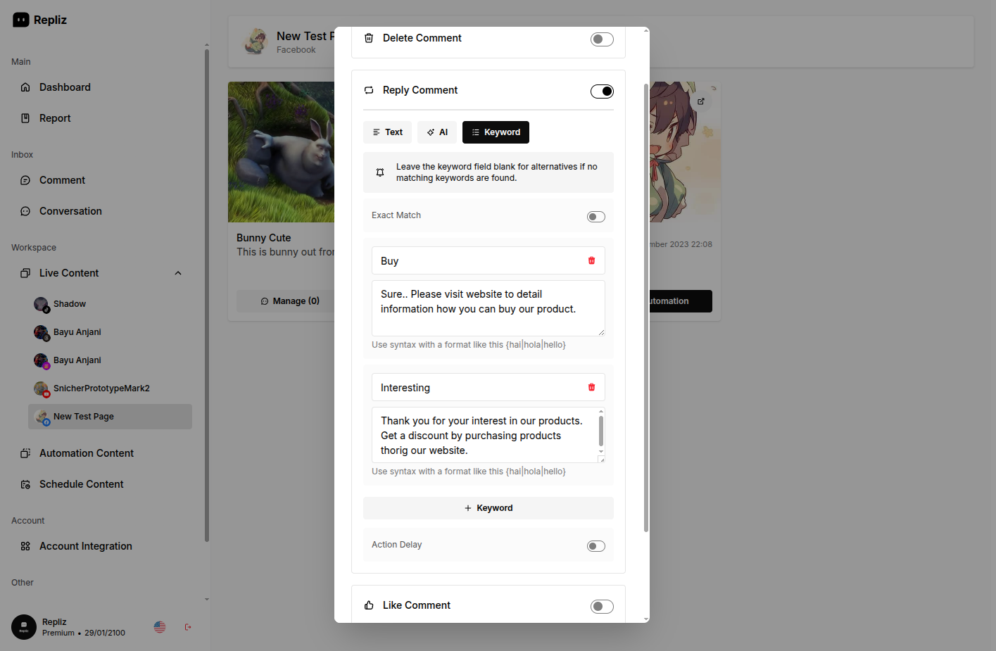 Untuk memulai pengaturan otomatisasi Balasan Komentar berdasarkan Kata Kunci, ikuti langkah-langkah berikut: